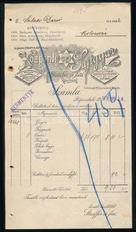 1910 Répcelak, Stauffer és Fiai Központi Sajtgyár fejléces számla