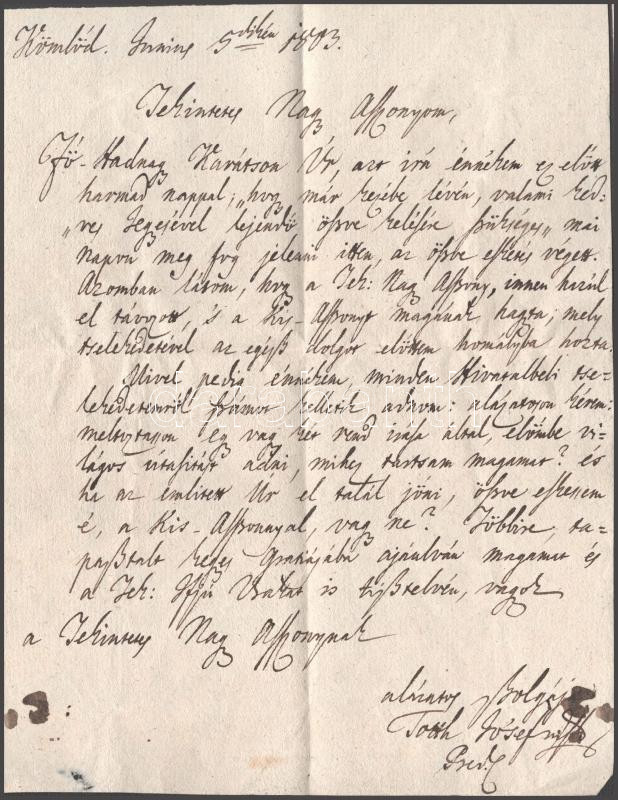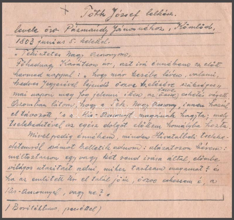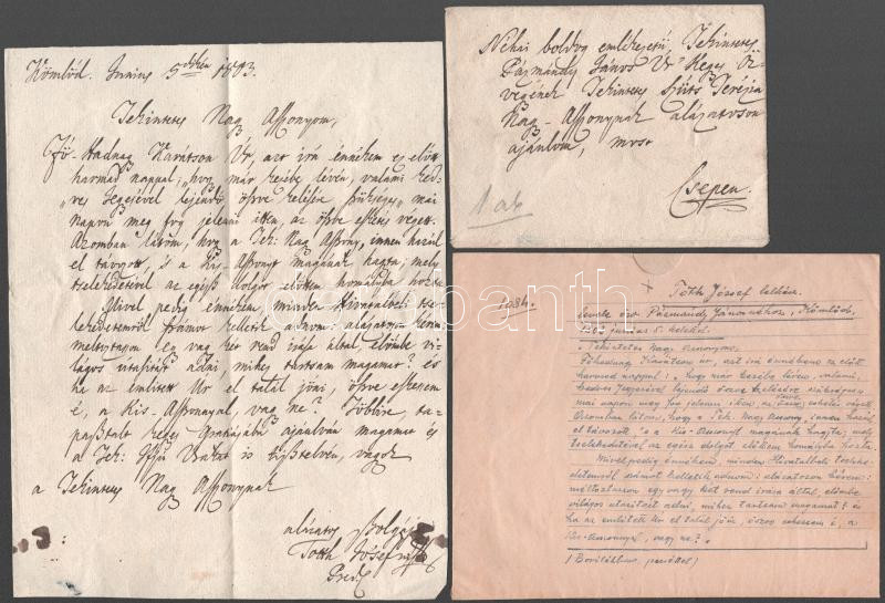 1803 Kömlőd, Tóth József magyar nyelvű saját kézzel írt levele, borítékkal, Vaskerényi Géza borítékjában