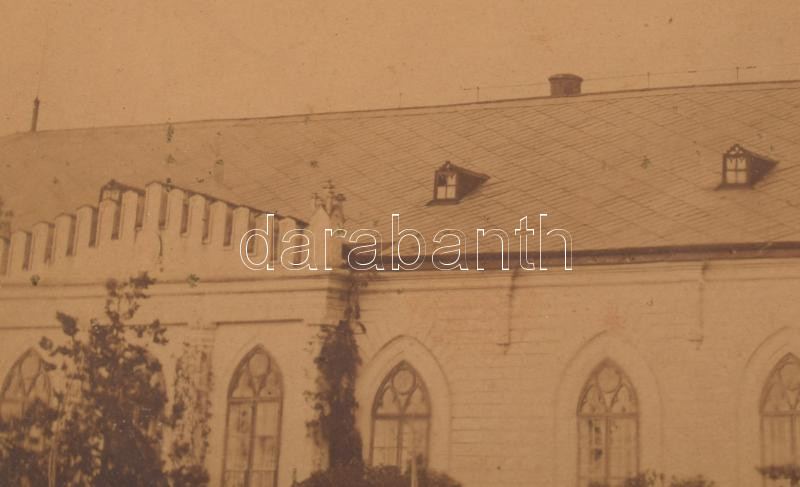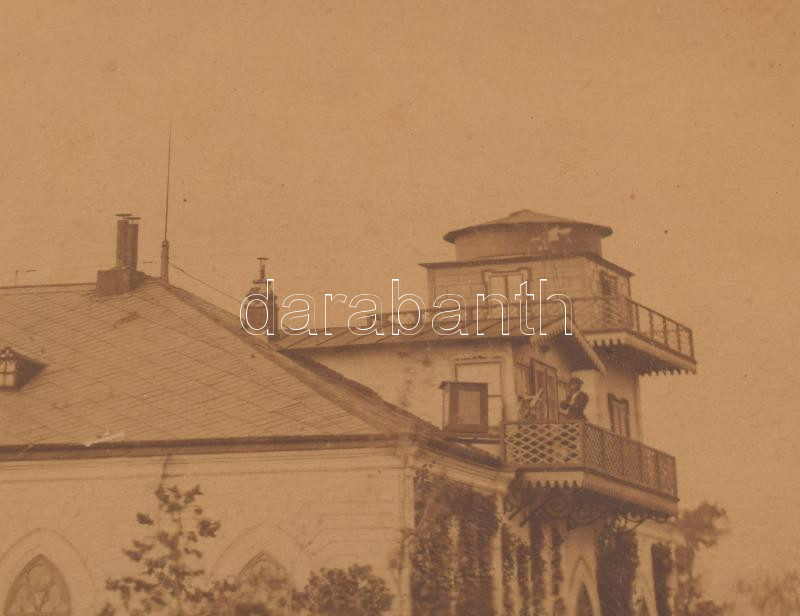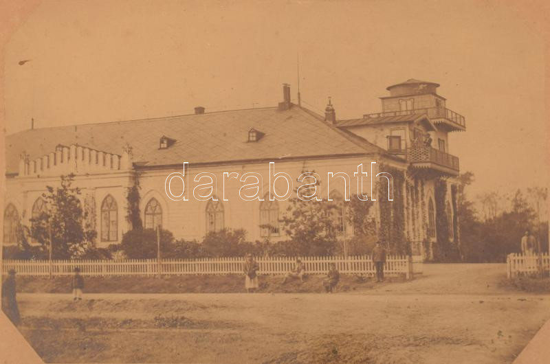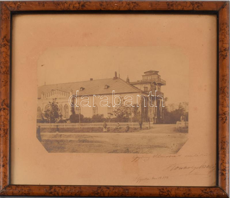 1874 Ógyalla (Stará Ďala / Hurbanovo), Konkoly Thege Miklós (1842-1916) csillagász, meteorológus, az MTA tagja, országgyűlési képviselő autográf aláírása és sorai az ógyallai Konkoly-kastélyt ábrázoló fotón, üvegezett keretben, fotó: 13,5x19 cm, keret: 25x29 cm