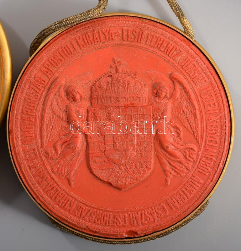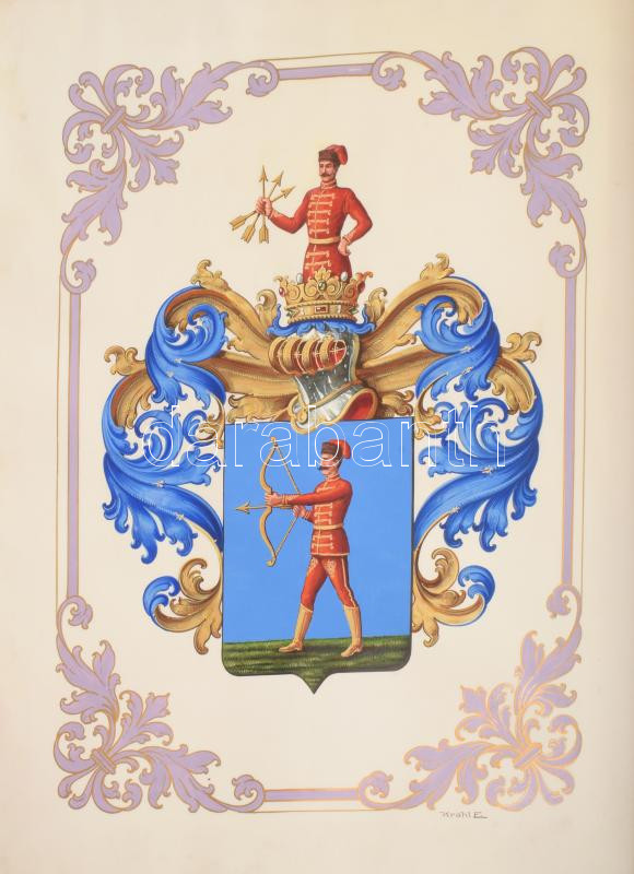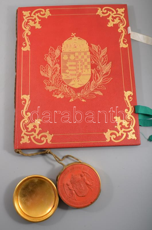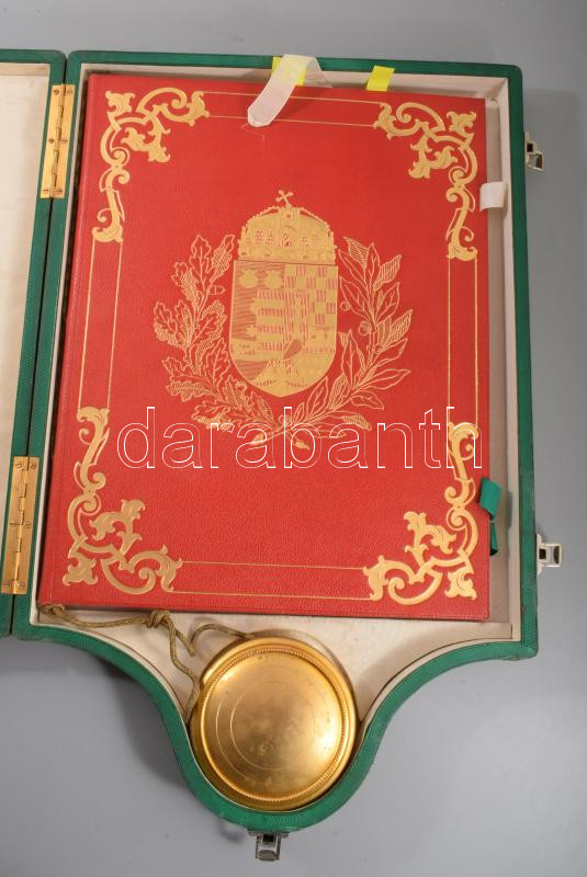 Nagyon dekoratív, hibátlan állapotú címereslevél, aranyozott egészbőr kötésben, tüziaranyozott réz tokban lévő jó állapotú függő viaszpecséttel, az oklevél, eredeti, zöld egészvászon borítású, csatos fa oklevéltartó ládikában, sarkain minimális kopással. Extra állapotú darab!