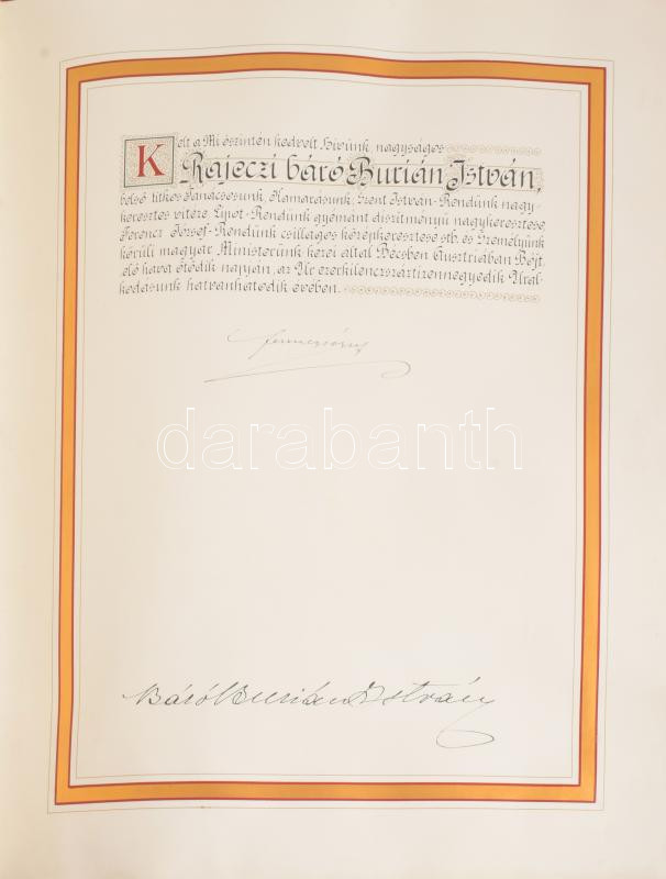 1 t pergamen lapon kézzel rajzolt címerábrázolás, 7 kézzel rajzolt oklevél oldal, magyar királyi címerrel az első oldalon, Az utolsó oldalon Ferenc József király (1830-1916) és báró Burián István (1851-1922) király személye körüli miniszter és közös külügyminiszter autográf aláírásával. Ulrich Mihály királyi tanácsos által jegyzett kihirdetési záradékkal.