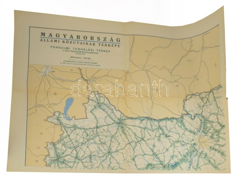 Magyarország áttekintő úttérképe (I. Darabterhelési térkép, II. Tonnaterhelési térkép, III. Célforgalmi térkép), 3 db egyenként 4 szelvényből álló, nagyméretű térkép, sérült kiadói mappában