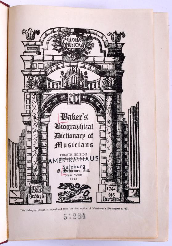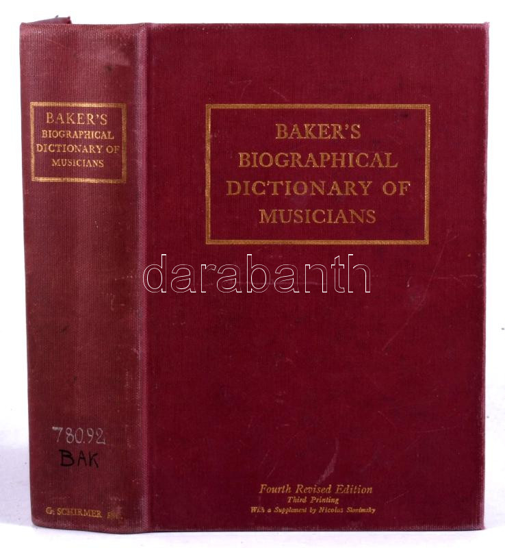 Baker's Biographical Dictionary of Musicians. Fourth Edition. Revised and Enlarged. New York, 1940, G. Schirmer, [16]+1298 p. Angol nyelven. Kiadói egészvászon-kötés, kissé kopottas borÃtóval.