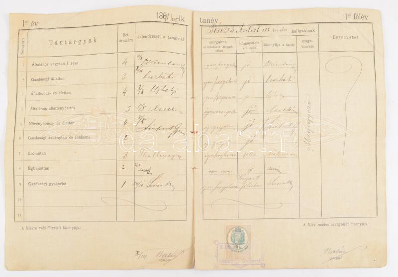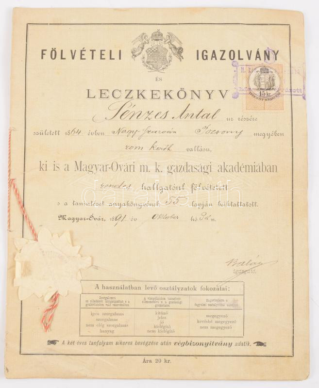 1891 Fölvételi igazolvány és leczkekönyv a Magyar-Óvári m. k. gazdasági akadémiára 12 p.
