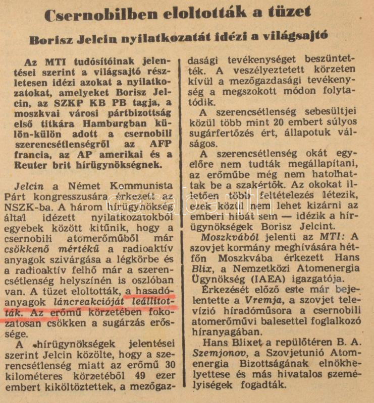 1986 A Csernobili atomerőmű szerencsétlenségről (hamisan) beszámoló magyar újságok 2 db