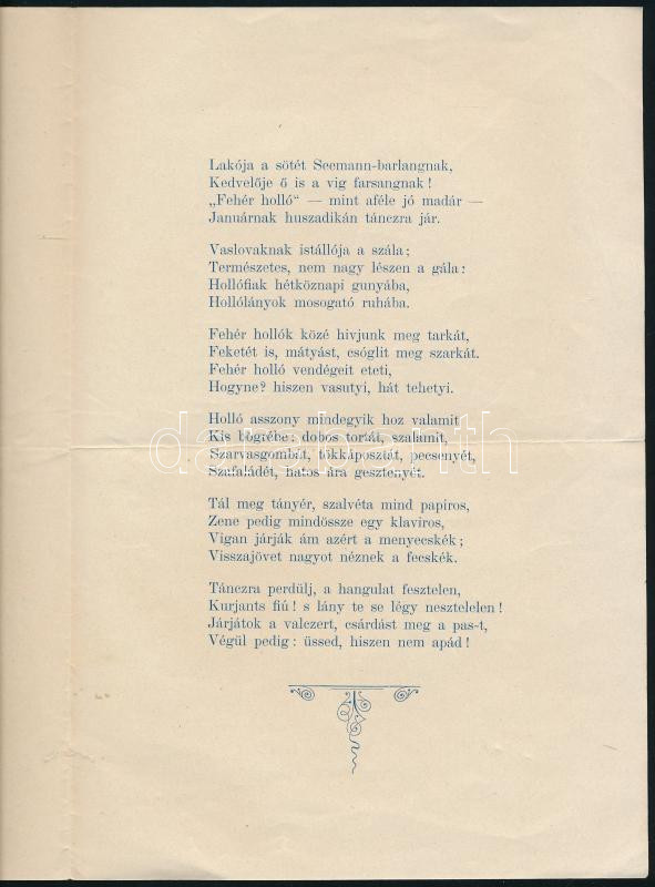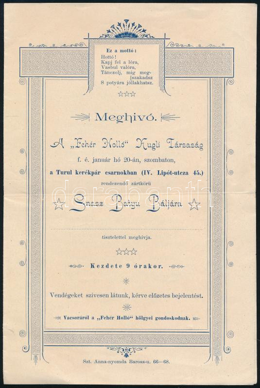 Description: cca 1910 A "Fehér Holló" Kugli Társaság által a Turul kerékpárcsarnokban rendezendő Snasz Batyu Báljára szóló meghívó, hajtásnyommal, jó állapotban, 2p