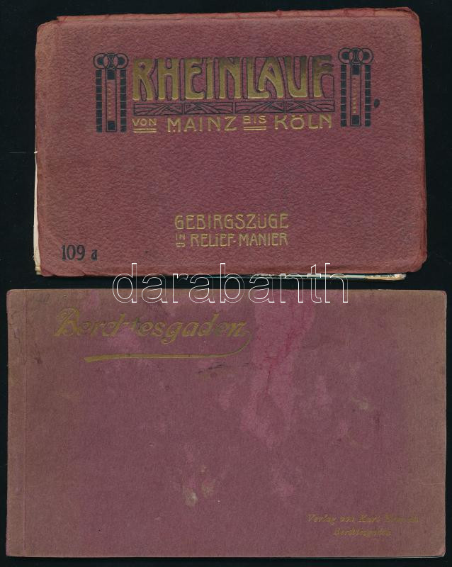 Description: cca 1914 Berchtesgaden, album 12 db fekete-fehér képpel, sérült borítóval, 12x20 cm + A Rajna Köln-Mainz szakasza, kihajtható, színes panorámakép, sérült, két részre vált, kb. 184x17 cm