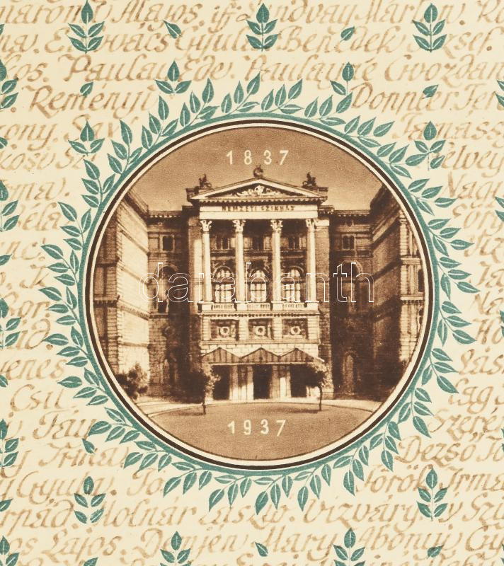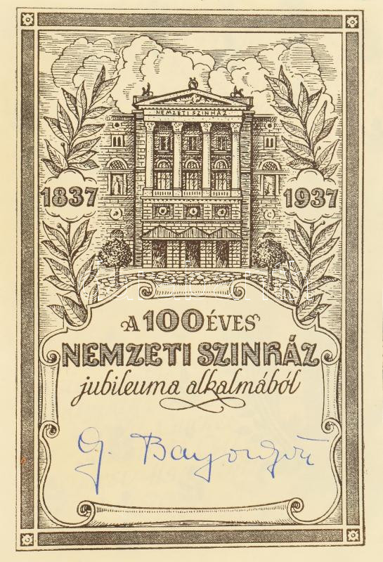 A százéves Nemzeti Színház. Az 1937/38-as centenáris év emlékalbuma. Bp. 1938, Pallas Irodalmi és Nyomdai Rt.,(Pallas-ny.), 351 p.+16 t. (színes, Horthy Miklós képpel!). Külön kis lapon Bajor Gizi (1893-1951) színésznő autográf aláírásával! Rendkívül gazdag szövegközti és egész oldalas képanyaggal. Kiadói aranyozott barna félbőr-kötésben, kissé kopott borítóval, kissé sérült gerinccel, két lap alján apró folttal, máskülönben jó állapotban. A tételhez tartozik 3 Nemzeti Színház műsoros füzet, számos reklámmal.