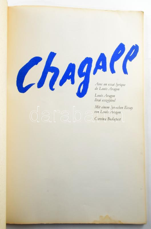 Chagall. Avec um essai lyrique de Louis Aragon. Louis Aragon lírai esszéjével. Mit einem lyrischen Essay von Louis Aragon. Ford.: Keszthelyi Rezső és Engel Géza. Szelényi Károly fotóival. Bp.,1973,Corvina. Francia, magyar és angol nyelven. Gazdag képanyaggal illusztrált. Kiadói papír-kötés, a borítón és a gerincen kopásnyomokkal.