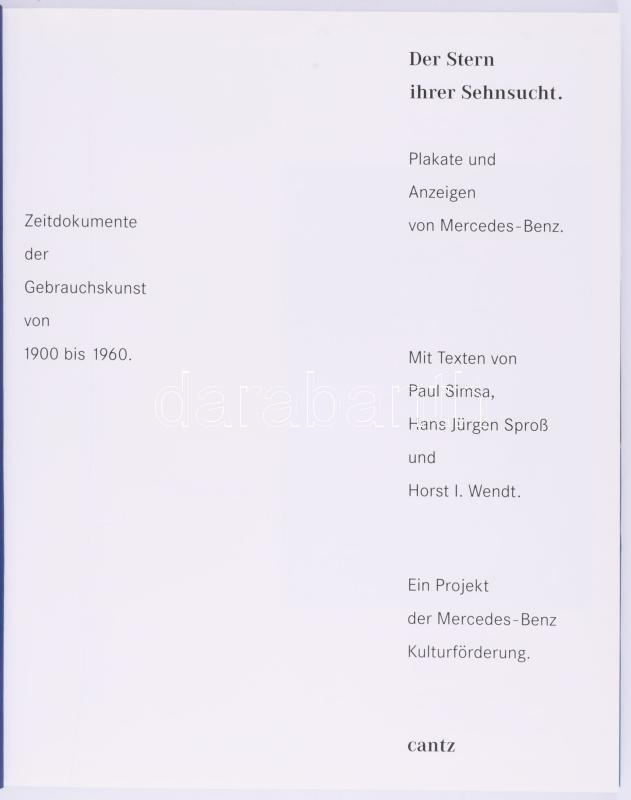 Der Stern ihrer Sehnsucht. Plakate und Anzeigen von Mercedes-Benz. Zeitdokumente der Gebrauchskunst von 1900 bis 1960. [Almaik sztárja. Mercedes-Benz plakátok és hirdetések. Iparművészeti történelmi dokumentumok 1900-tól 1960-ig.] Mit Texten von Paul Simsa, Hans Jürgen Sproß und Horst I. Wendt. Stuttgart - Ostildern-Ruit,1995,Mercedes Benz AG. Német nyelven. Gazdag képanyaggal illusztrált. Kiadói kartonált papÃrkötés.