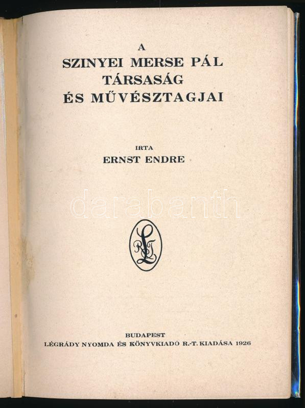Ernst Endre: A Színyei Merse Pál Társaság és művésztagjai. Bp., 1926., Légrády, 76p. Fekete-fehér képekkel, többek közt Szőnyi István, Fényes Adolf, Vaszary János, Csók István alkotásainak reprodukcióival illusztrált. Kiadói papírkötésben, modern professzionális átlátszó védőfóliában, megerősített gerinccel.