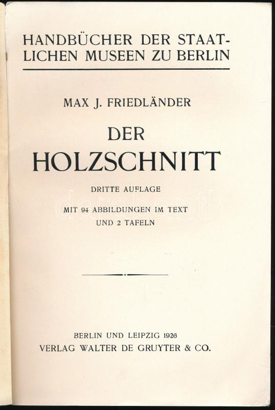 Friedländer, Max J.: Der Holzschnitt. Berlin, 1926., Gruyter. A famets... https://www.darabanth.com/en/515-Auction-philately-postcards-numismatics-artwork-books-collectibles-jewelry/518.0/Books/Books-Architecture-Art~1042/Friedlander-Max-J-Der-Holzschnitt-Berlin-1926-Gruyter-A-fametszetkeszitest-bemutato-ne~II3488653