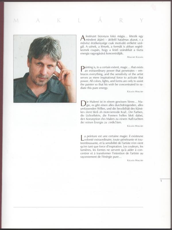 Description: Makláry. (Makláry Kálmán festőművész.) [Hajdúszoboszló], 2007, magánkiadás, 64 p. Színes reprodukciókkal illusztrálva. Magyar, angol, német és francia nyelven. Kiadói kartonált papírkötés.
