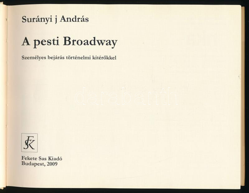 Surányi J. András: Pesti Broadway. Személyes bejárás történelmi kitérő... https://www.darabanth.com/en/515-Auction-philately-postcards-numismatics-artwork-books-collectibles-jewelry/518.0/Books/Books-Architecture-Art~1042/Suranyi-J-Andras-Pesti-Broadway-Szemelyes-bejaras-tortenelmi-kiterokkel-Bp-2009-Feke~II3470199