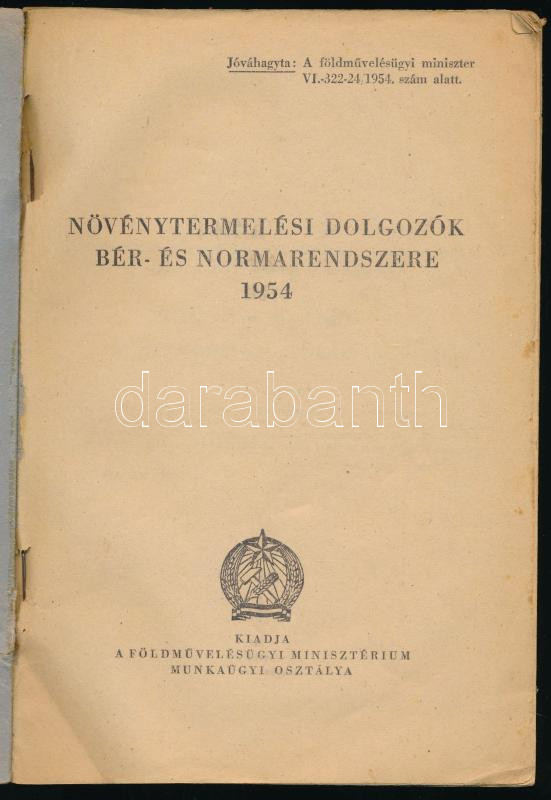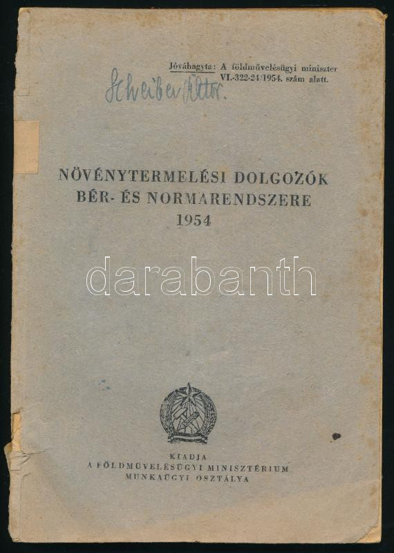 1957 Növénytermelési Dolgozók Bér- és Normarendszere. Bp., 1954, Földművelésügyi Minisztérium Munkaügyi Osztálya, 128 p. Kiadói papírkötés, sérült gerinccel, a gerincen címkével, foltos, szakadt borítóval.