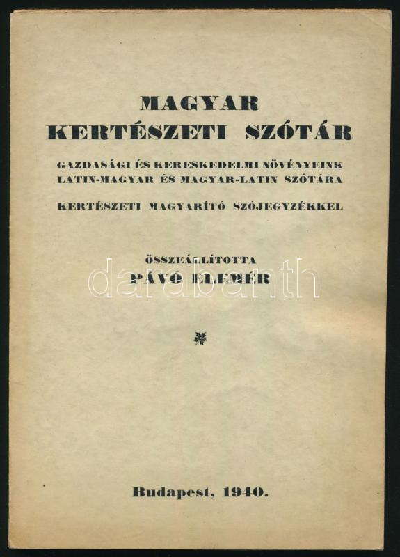 Pávó Elemér: Magyar kertészeti szótár. Bp., 1940, Szerző. Kiadói papírkötés, jó állapotban.
