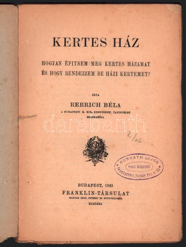Rerrich Béla: Kertes ház. Hogyan építsem meg kertes házamat és hogy rendezzem be házi kertemet? Bp., 1922, Franklin-Társulat, 128 p. Kiadói papírkötés, kis sérüléssel