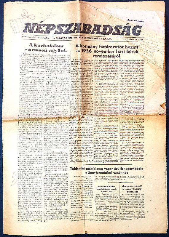 [Folyóirat, 1956.] "A karhatalom nemzeti ügyünk. Szervezkedett, gyilkolt az ellenforradalmi terror, de a földet még sem tudták elvenni a parasztoktól! Több mint másfél ezer vagon áru érkezett a Szovjetunióból hazánkba". A hatalmát megszilárdÃtó, kollaboráns Kádár-kormány hivatalos lapjának, a Népszabadságnak lapszáma a megtorlás kezdÅ‘dÅ‘ napjaiban. I. évfolyam, 20. szám. (1956. november 29.)