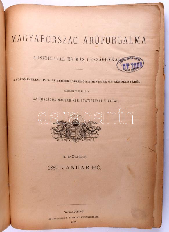 Description: Magyarország árúforgalma Ausztriával és más országokkal. A földmivelés-, ipar- és kereskedelemügyi minister úr rendeletéből szerk. és kiadja az Országos Magyar Kir. Statistikai Hivatal. I-XII. füzetek. 1887. január-december. [Egybekötve.] Bp., 1887, Athenaeum. Félvászon-kötésben, sérült, megviselt állapotban, különvált hátsó kötéstáblával.