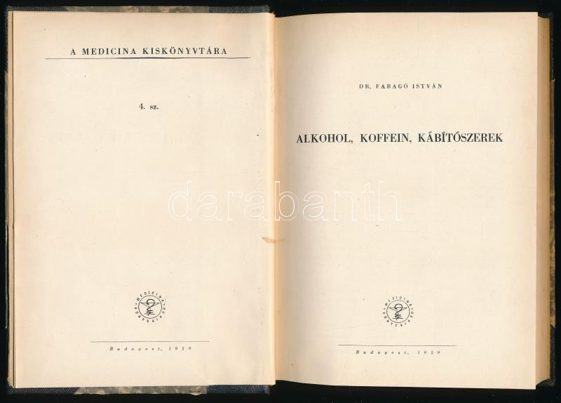 Faragó István: Alkohol, koffein, kábítószerek. Medicina Kiskönyvtára 4. sz. Bp., 1959, Medicina, 203 p. Átkötött félvászon-kötés, volt könyvtári példány.
