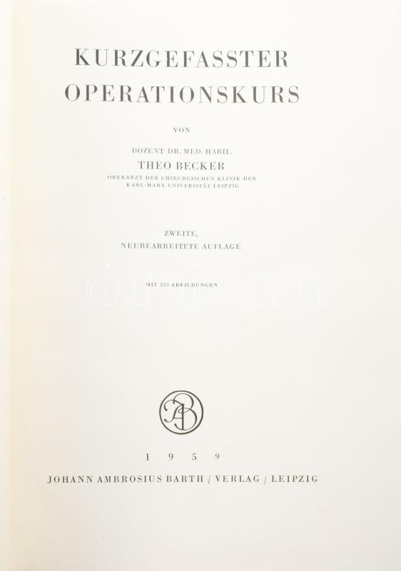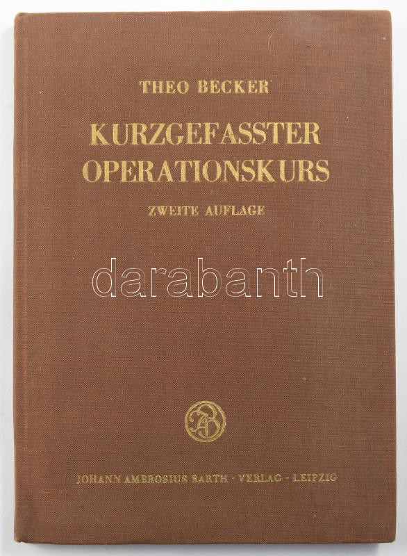 Theo Becker: Kurzgefaster Operationskurs. Leipzig, 1959, Johann Ambrosius Barth, VI+148+6 p. Zweite, Neubearbeitete Auflage. Német nyelven. Fekete-fehér fotókkal. Kiadói aranyozott egészvászon-kötés.