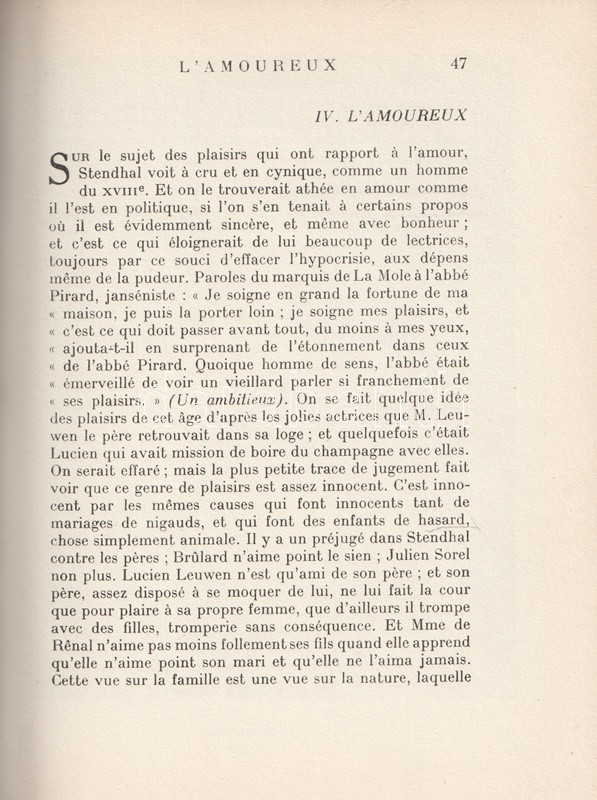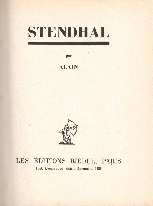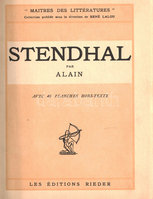 Émile-Auguste Chartier (1868-1951) francia filozófiatörténész, egyetemi tanár, közíró, a XX. század első évtizedeinek ünnepelt, szabadelvű tárcaírója. Stendhal-életrajzában a neves realista írónak állít emléket, ám az életrajz korántsem időrendben halad, hanem több, egymással párhuzamos és egymást kiegészítő Stendhal-képet ad: Stendhalról, a politikusról, Stendhalról, a szerelem elméletírójáról, Stendhalról, a zenekritikusról és Stendhalról, az elbeszélőről. Rendhagyó kismonográfiája gazdag képanyagát a grenoble-i Standhal Múzeum biztosította. Kötetünkből 43 számozott példány is készült, példányunk számozatlan.