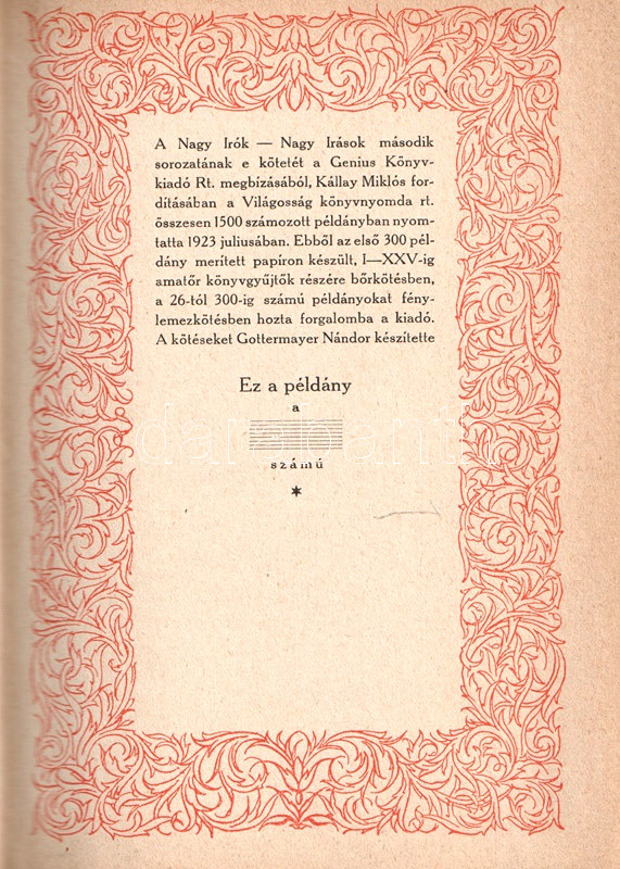 Kolofon: "A Nagy írók- Nagy írások második sorozatának e kötetét a Genius Könyvkiadó Rt. megbízásából Kállay Miklós fordításában a Világosság Rt. összesen 1500 példányban nyomtatta. Ebből az első 300 példány merített papíron készült, I-XXV-ig amatőr könyvgyűjtők részére bőrkötésben, a 26-tól 300-ig számú példányokat fénylemezkötésben hozta forgalomba a kiadó".