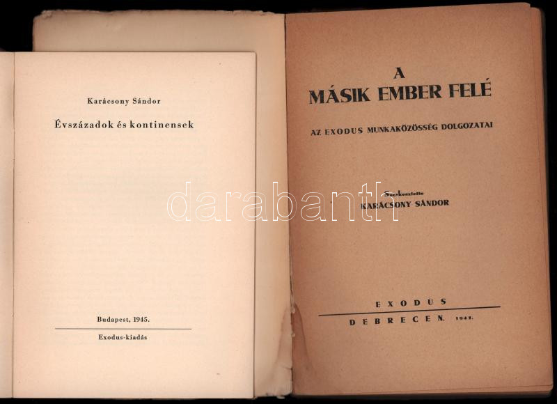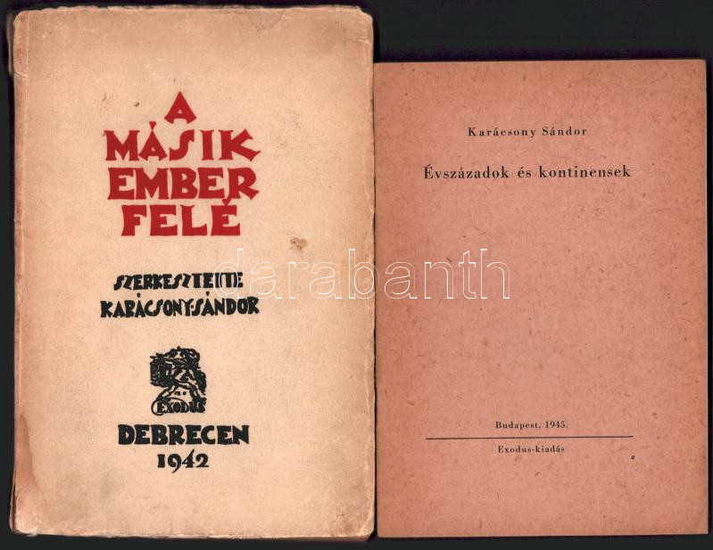 Karácsony Sándor (szerk.): A másik ember felé. Az Exodus munkaközösség dolgozatai. Debrecen, 1942, Exodus, 122+(2) p. Kiadói papírkötés, kopott, kissé foltos borítóval, sérült gerinccel. + Karácsony Sándor: Évszázadok és kontinensek. Bp., 1945., Exodus,(Gyoma, Kner-ny.), 15+1 p. Megjelent 1000 példányban. Kiadói papírkötés.
