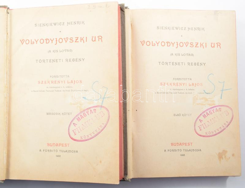 Sienkiewicz Henrik: Volyodyjovszki úr. (A kis lovag.) 1-2. kötet. Fordította: Szekrényi Lajos. Bp.,1902, Fordító, (Stephanaeum-ny.),290 p.; 283+1 p. Kiadói, díszesen festett, aranyozott, szecessziós virágornamentikával díszített egészvászon kötésben, Gottermayer-kötés, kopott borítóval, régi bélyegzésekkel.