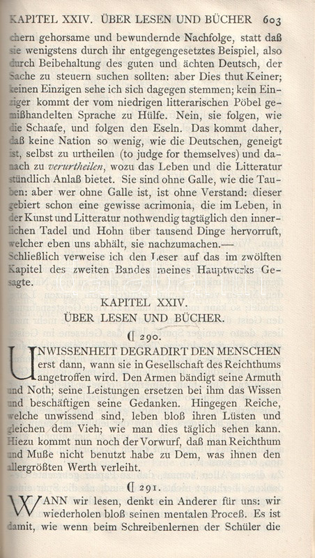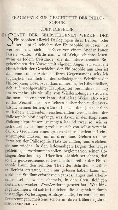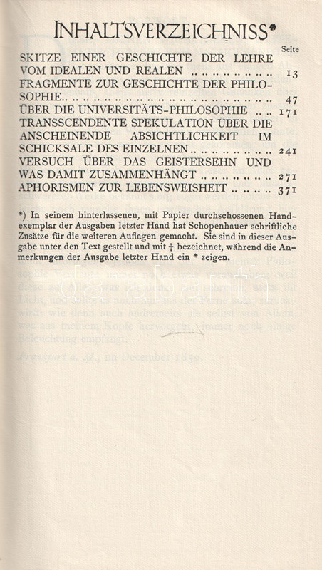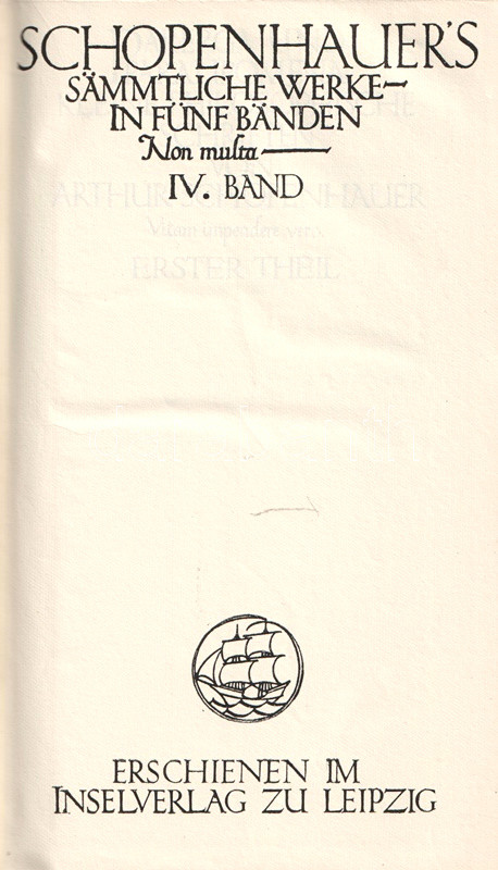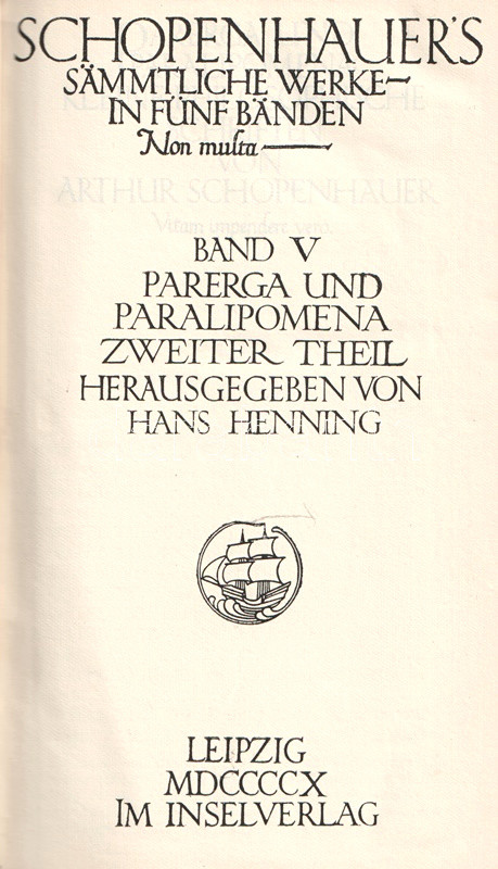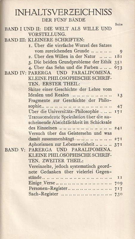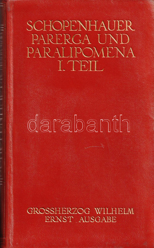 Köteteink a német filozófiai írók munkáit bibliofil kiállításban közreadó "Grossherzog Wilhelm Ernst Ausgabe"-sorozatban jelentek meg. Példányaink a sorozat Schopenhauer-kiadásához tartoznak, annak két utolsó, szorosan összetartozó, önmagában is értelmezhető köteteit alkotják. "Parerga und Paralipomena" című munkájában Schopenhauer kisebb filozófiai írásait, filozófiai dialógusait adta közre szerteágazó témákban. A két kötetében szó esik az iskolai filozófia hiábavalóságáról, az olvasók és könyvek szerepéről, de rövidebb-hosszabb analízis alá kerül az etika, az államelmélet, a vallás, az esztétika (e két utóbbi fogalom Schopenhauer gondolatvilágában sokrétűen és kritikus módon függ össze).