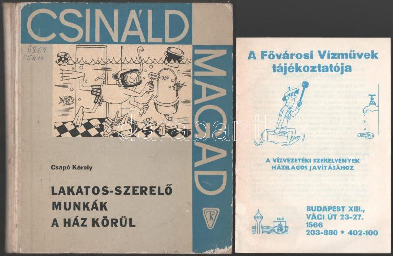 Description: 2 db kiadvány - Csapó Károly: Lakatos-szerelő munkák a ház körül. Bp., 1969, Táncsics. Félvászon kötés, kissé kopottas állapotban. + A Fővárosi Vízművek tájékoztatója a vízvezeték-szerelvények házilagos javításához