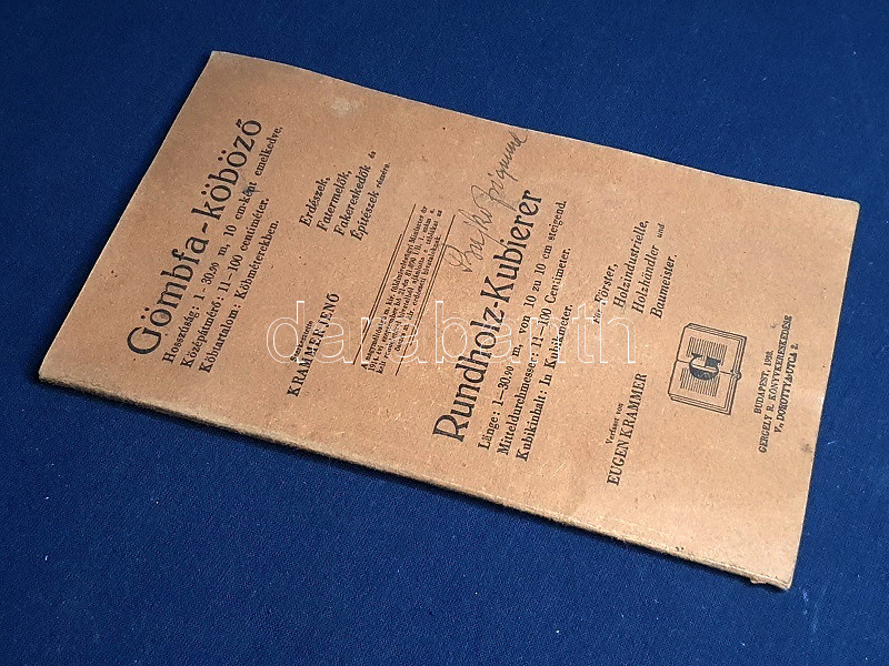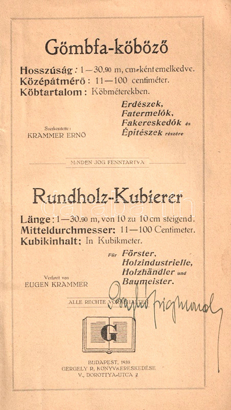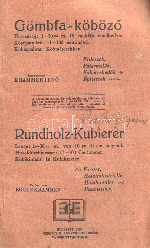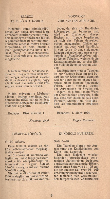 Krammer Jenő szakíró a századfordulótól kezdve adott ki különféle faipari számítási táblázatokat. Kiadványunk a vágott fa köbtartalmának kiszámítására szolgáló köbtáblázatokat közli: szakkiadványunk ebben a formában először 1924-ben látott napvilágot, példányunk a sokadik utánnyomásból való.