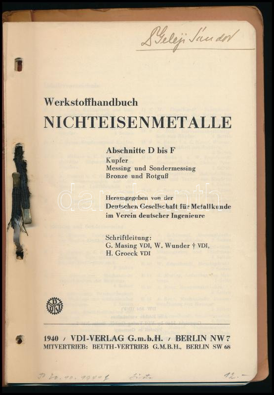 Description: Werkstoffhandbuch Nichteisenmetalle. Herausgegeben von der Deutschen Gesellschaft für Metallkunde im Verein deutscher Ingenieure. Berlin, 1940, VDI-Verlag. Német nyelven. Papírborítóban.