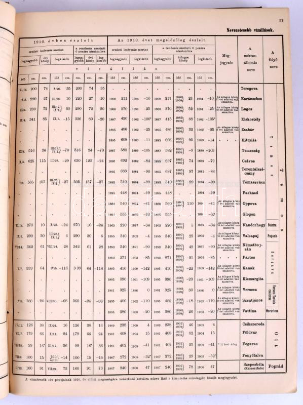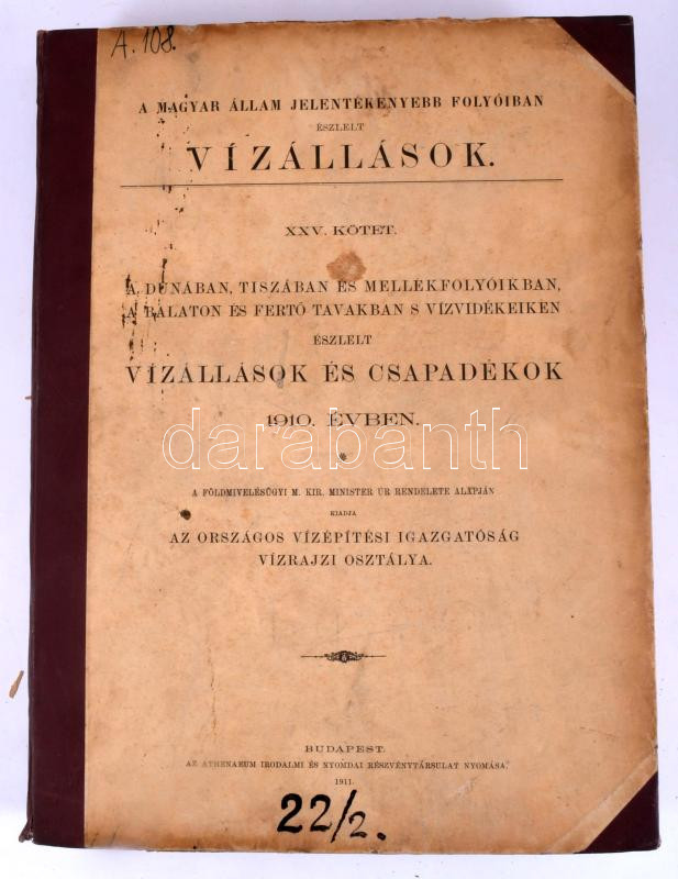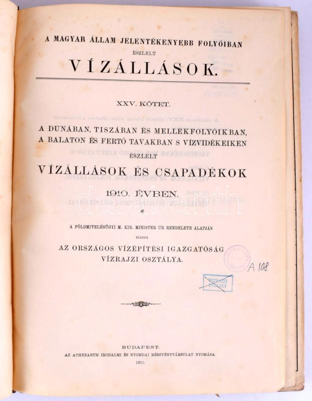 A Magyar Állam jelentékenyebb folyóiban észlelt vízállások. XXV. köt. A Dunában, Tiszában és mellékfolyóikban, a Balaton és Fertő tavakban s vízvidékeiken észlelt vízállások és csapadékok 1910. évben. A földmivelésügyi m. kir. minister úr rendelete alapján kiadja az Országos Vízépítési Igazgatóság Vízrajzi Osztálya. Bp., 1911, Athenaeum, 529+[5] p.+ 20 (mellékletek) t. Kiadói félvászon-kötés, kissé viseltes, foltos borítóval, helyenként kissé foltos lapokkal, részben szétváló fűzéssel.
