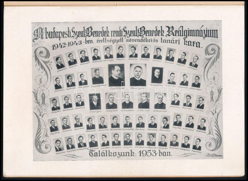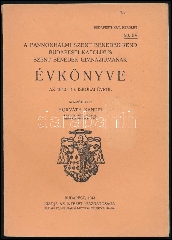 A Pannonhalmi Szent Benedek-Rend Budapesti Katolikus Szent Benedek Gimnáziumának évkönyve az 1942/43. iskolai évéről. Bp., 1943, Intézet Igazgatósága, ("Élet"-ny.),71+1 p. 1943, Királyi Nyomda, 71+1 p. +2 (fekete-fehér képtáblák, az egyik tablófotó) t. Kiadói papírkötés.