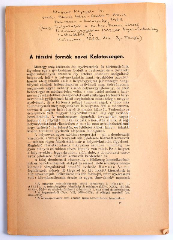 Árvay József: A térszíni formák nevei Kalotaszegen. [Magyar Népnyelv IV.] Kolozsvár, 1943., 3-50 p. [Különlenyomat a Dolgozatok a M. kir. Ferenc József Tudományegyetem Magyar Nyelvtudományi Intézetéből 9. számából.] Kiadói papírkötés.