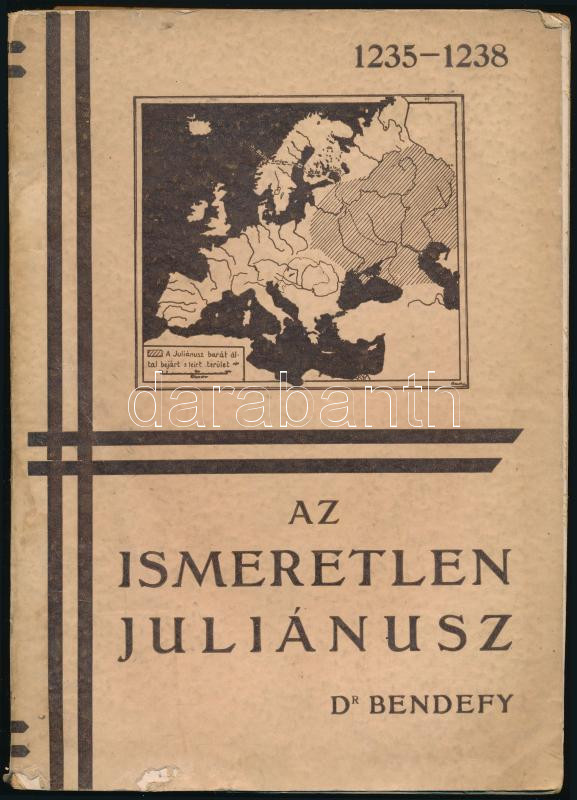 Bendefy László: Az ismeretlen Juliánusz: A legelső magyar ázsiakutató életrajza és kritikai méltatása. Bp., 1936., Stephaneum. 183 + 2 p. + 1 t Fekete-fehér fotókkal, és egy kihajtható térképpel illusztrált. Kiadói papírkötésben enyhe sérüléssel, foltos hátsó borító