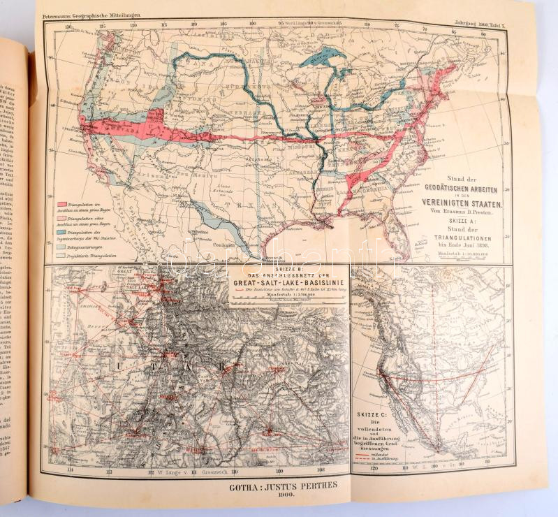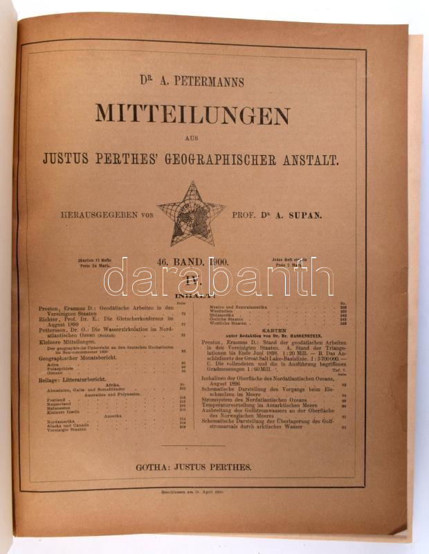 Dr. A. Petermanns [Geographische] Mitteilungen aus Justus Perthes' Geographischer Anstalt. 46. Band, 1900. IV., Hozzákötve: 48. Band, 1902. VII. Hozzákötve: Geographischer Anzeiger. III. Jahrgang. Juli. 1902. Hozzákötve: 48. Band, 1902. X. Hozzákötve: Geographischer Anzeiger. III. Jahrgang. Oktober 1902. Hozzákötve: 48. Band 1902. XI. Hozzákötve: Geographischer Anzeiger. III. Jahrgang. November 1902. Hozzákötve: 53. Band, 1907. XII. Hozzákötve: Geographischer Litteratur-Bericht für 1907. Gotha, 1900-1909., Justus Perthes, 73-96+57-72 p.+1 t.;+49-64+173-196+121-136 p.+1 t.;+145-168+113-128 p.+1 t.; +97-112+217-244+169-184 p.+1 t.;+145-160+245-268 +185-208+161-176+VI+269-292+XIV+217-240 p.+2 t.; 73-96+65-72+81-88+17-20 p.+2 t.+97-120+89-112+21-24 p.+7 (térkép-mellékletek, tokban, a kötet végén) t. Kötet végén, a tokban: Lord Cromer: Das heutige Aegypten, 5 sztl. lev. Német nyelven. Átkötött modern műbőr-kötésben.