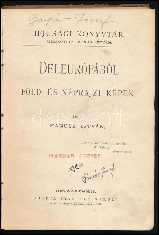 Hanusz István: Déleurópából föld- és néprajzi képek. Ifjusági Könyvtár.; Pozsony, Bp., é.n Stampfel. Sérült vászonkötésben