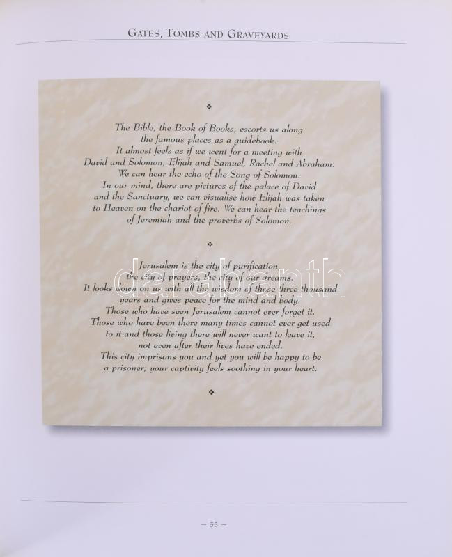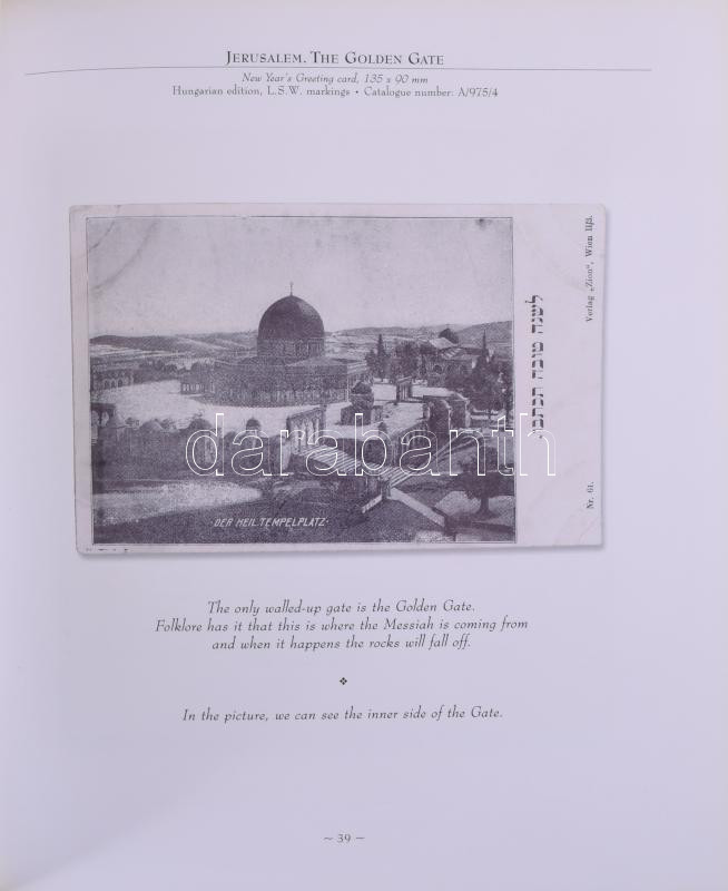 Jerusalem Old Jewish Postcards. Szerk.: Toronyi, Zsuzsa. Erdei Grünwald Mihály jegyzeteivel. Bp., 1999., Magyar Könyvklub. Gazdag képanyaggal illusztrált. Kiadói egészvászon-kötés, papÃr védÅ‘borÃtóban.;