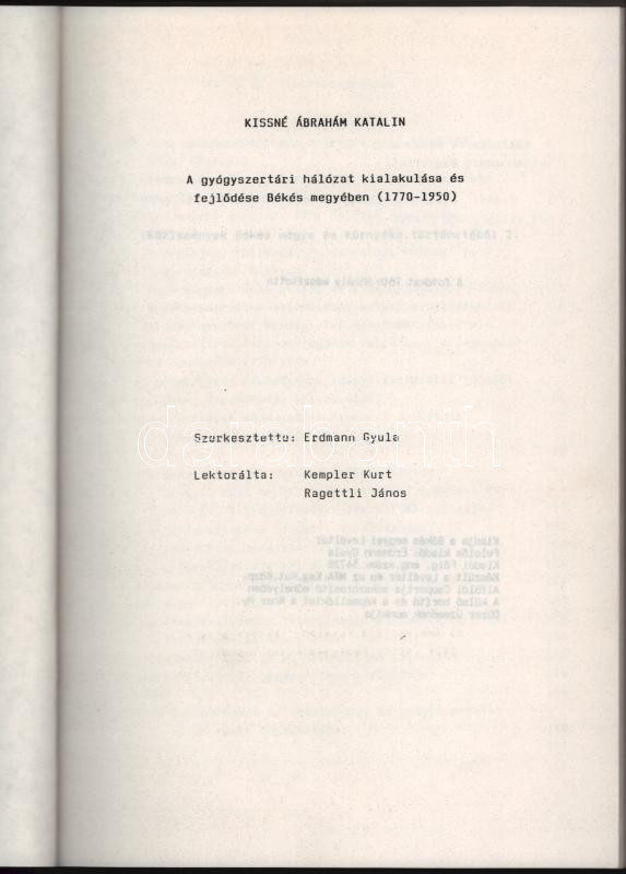 Kissné Ábrahám Katalin: A gyógyszertári hálózat kialakulása és fejlődése Békés megyében (1770-1950). Közlemények Békés megye és környéke történetéből 2. [Gyula, 1988], Békés megyei Levéltár. Fekete-fehér és színes képekkel illusztrálva. Kiadói papírkötés, kiadói papír védőborítóban.