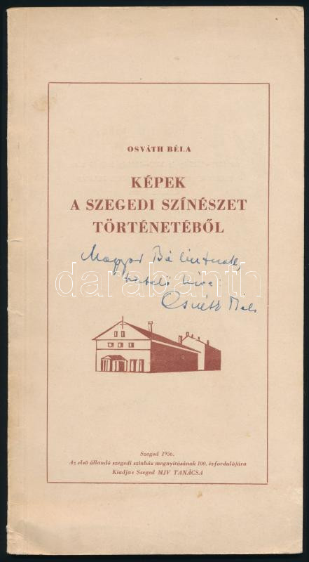Osváth Béla: Képek a szegedi színészet történetéből. DEDIKÁLT! Szeged, 1956., Szeged MJV Tanácsa, VIII+64 p. Fekete-fehér illusztrációkkal. Megjelent 3000 példányban. Kiadói papírkötésben,