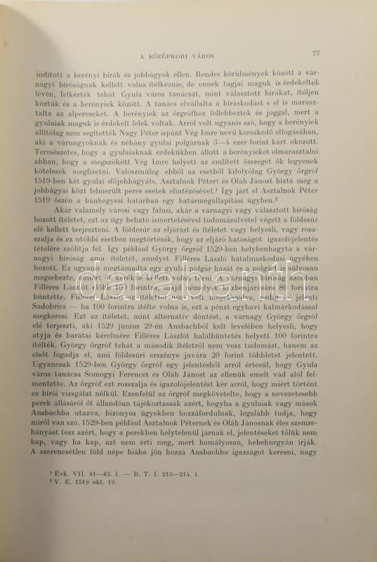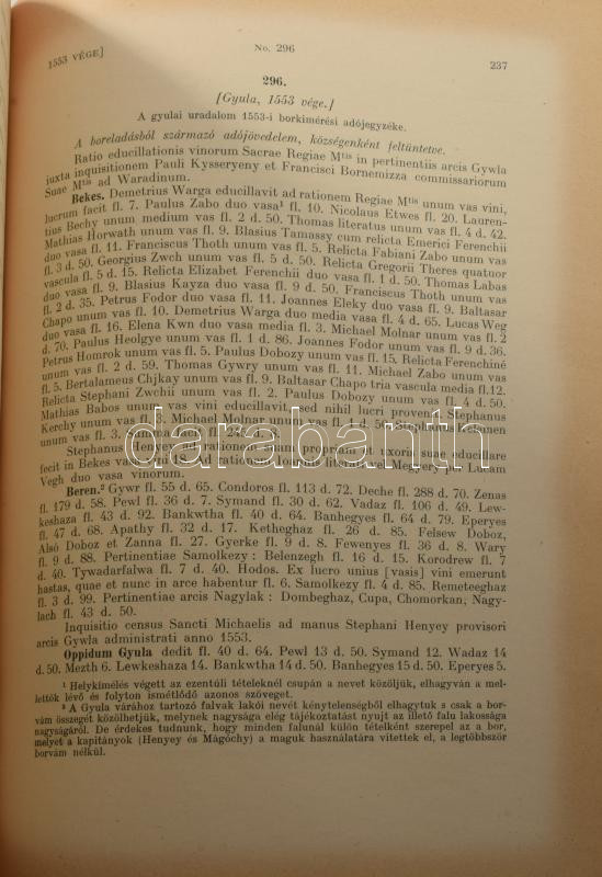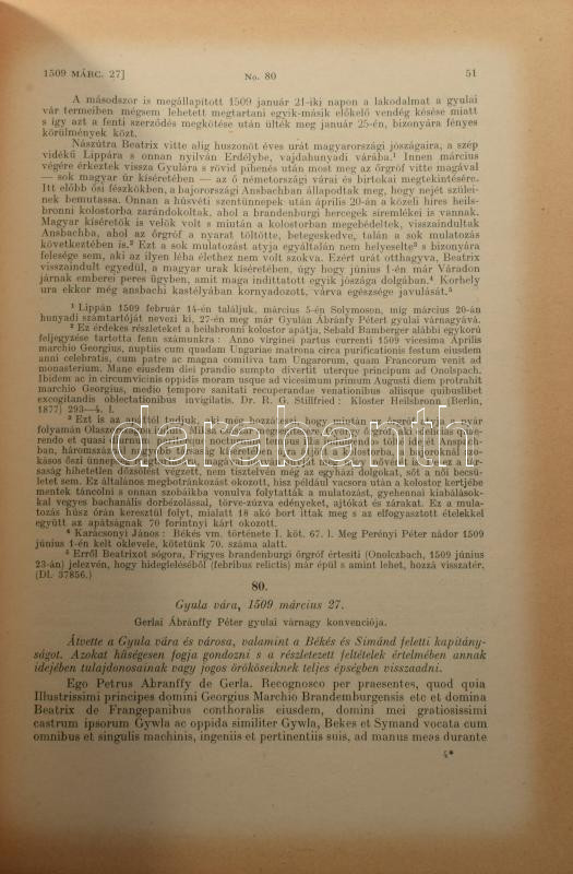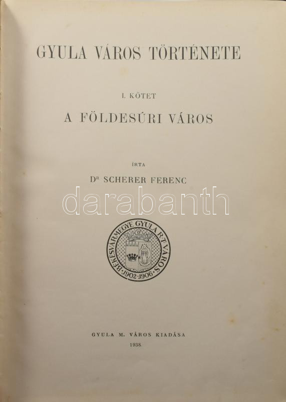 Scherer Ferenc: Gyula város története. I-II. köt. (I.: A földesúri város. II.: A rendezett tanácsú város.) + Gyula város oklevéltára (1313-1800). Szerk.: Veress Endre. Bp., 1938, Gyula m. város kiadása (Stephaneum-ny.), 478 p.+8 (kihajtható) t.; 469 p.+1 (színes) t.+ 1 (színes, kihajtható térkép) t.; XII p.+ 1 t.+ 500 p. Kiadói aranyozott egészvászon-kötés, nagyrészt jó állapotban.