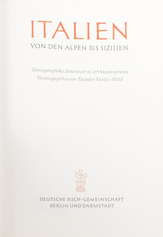 Theodor Müller-Alfeld (szerk.): Italien von den Alpen bis Sizilien. Unvergängliche Schönheit in 255 Meisterphotos. Berlin-Darmstadt, 1958, Deutsche Buch-Gemeinschaft. Fekete-fehér fotókkal illusztrálva. Német nyelven. Kiadói félbőr-kötés.