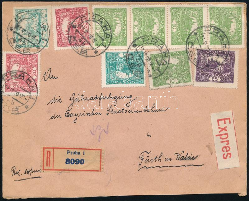 1920 Ajánlott expressz levél 10 db bélyeggel bérmentesítve / Registered express cover with 10 stamp "PRAHA"