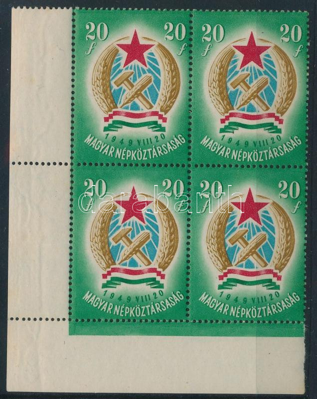 1949 Alkotmány 20f ívsarki négyestömb két bélyegen makkos vízjellel (27.000)