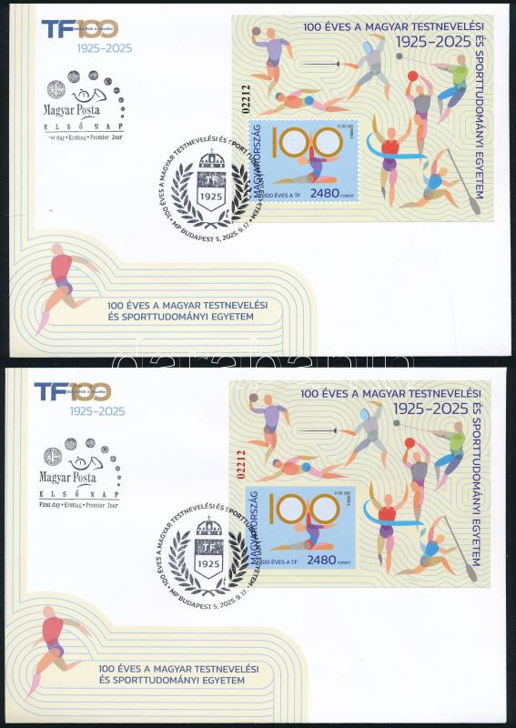 2025 100 éves a Magyar Testnevelési és Sporttudományi Egyetem fogazott és vágott blokk FDC-n, azonos sorszámmal