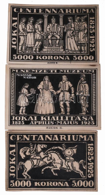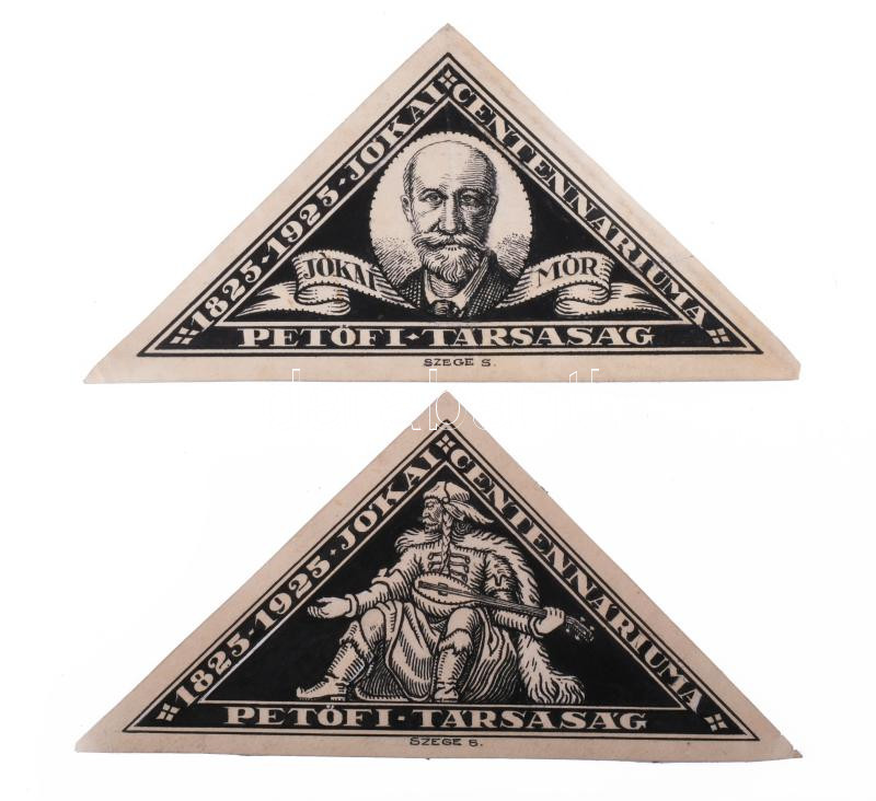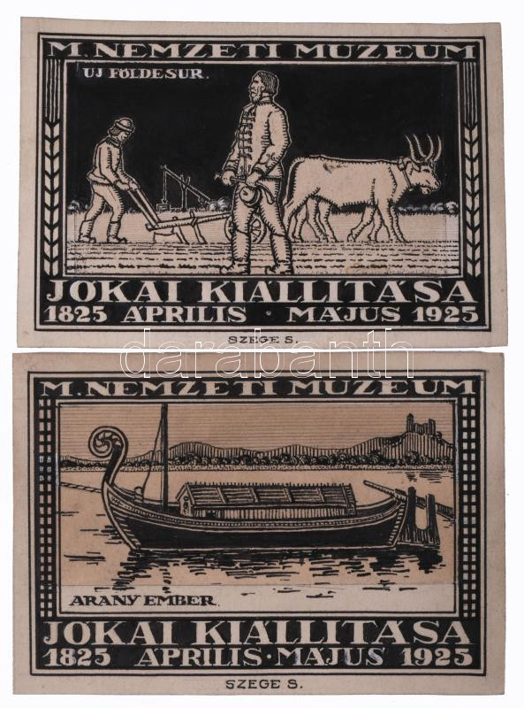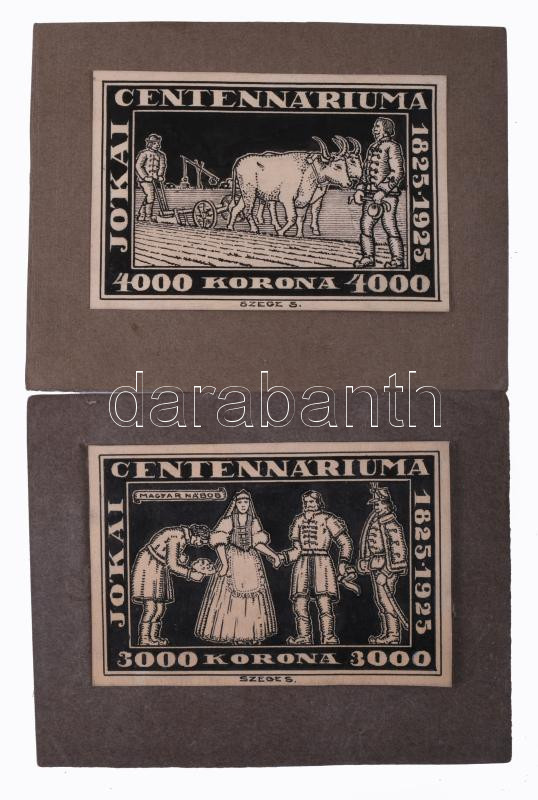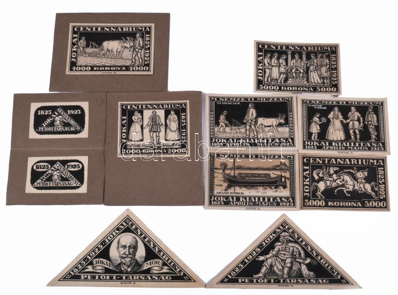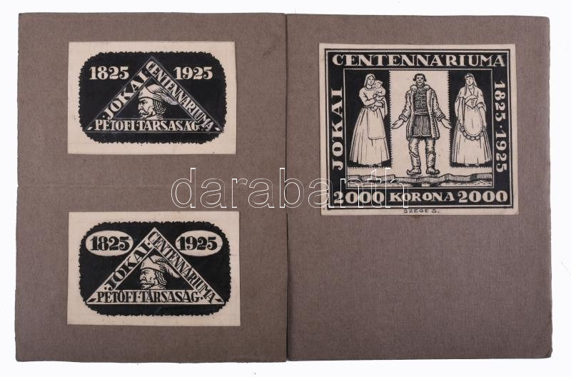 Szege Sándor szobrászművész Jókai centenáriumi emlékbélyege és adománybélyegei terveinek nyomdai fotói összesen 20 db (9 különféle), 76 db megvalósult fogazott vagy vágott emlékbélyeg több féle színben, Jókai kiállítás 4 klf részben fogazatlan levélzáró + a Petőfi társaság felhívása emlékbélyeg használatára, a Múzsa Irodalmi és Művészeti RT megbízó levele Szege Sándor részére, továbbá 3 kapcsolódó újságcikk + Szege Sándor (1883-1945): Jókai Mór születésének centenáriuma alkalmából készített emlékbélyeg és levélzáró tervek, össz. 12 db, 1925. Tus, papír. Többségében jelzett. Részben korabeli kartonra kasírozva. 5,5x8 és 10x20 cm közötti méretekben.