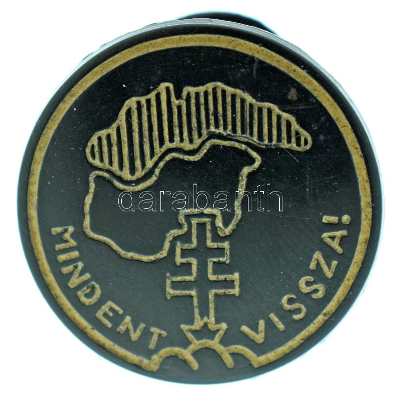 1938 k. "Mindent vissza!" irredenta bakelit jelvény Magyarország és Csehszlovákia szlovákiai részének (Felvidéknek) ábrázolásával. Nagy valószÃnűséggel az elsÅ‘ bécsi döntés elÅ‘tt készülhetett. "Univerzit 144" gyártói jellel (20mm) T:AU