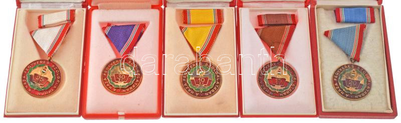 1965. "Szolgálati Érdemérem - A Haza Fegyveres Szolgálatában" 10, 15, 20, 25 és 30 év után műgyantás bronz kitüntetések mellszalagon, szalagsávval, eredeti tokban (5xklf) T:AU-VF, zománchiba